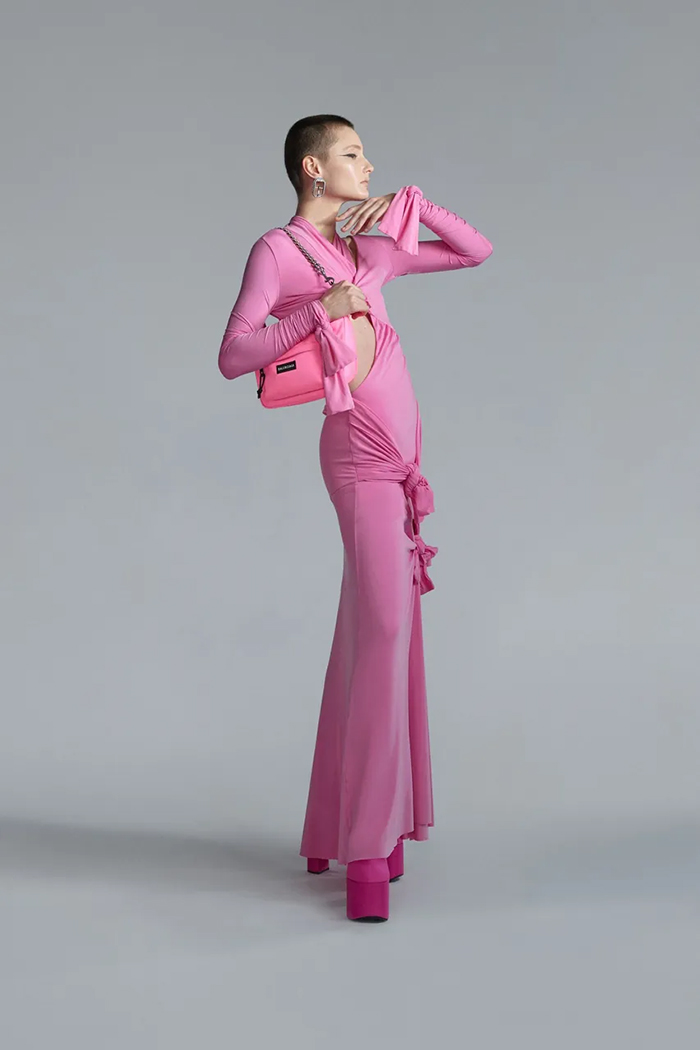 在这个系列中,有多款先锋单品,例如小牛皮制手套托特包“GLOVE LARGE TOTE BAG”、金属链条与网布材质组成的“DUTY FREE LARGE TOTE BAG”,以及小高领素面连衣裙、粉色打结礼服等多套裙装。
