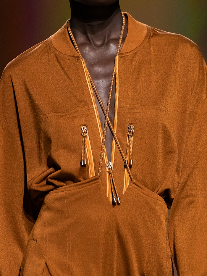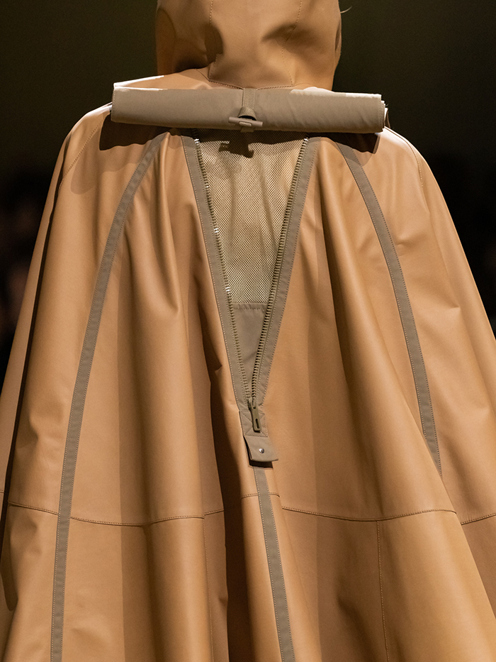 女装系列打造一场回归自然的短暂露营。服装渐次呈现赭黄色、乌木色、浅褐色与沙漠棕色,似从一面编网、一张吊床抑或一顶纱窗直接裁下。
