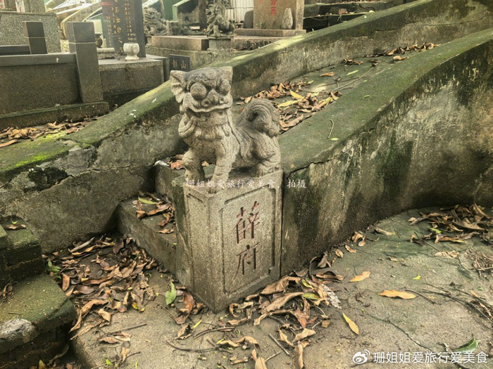 在墓地现场,薛觉先与夫人的合墓,就像他的艺术人生一样,既有传统韵味又透着革新精神:墓由护岭、坟头、石碑、山手、拜台等部分组成,墓穴以水泥构筑成半月形,在岭南墓葬中属典型的山手坟形制。坟头的花岗岩碑石上,"先考讳觉先薛公府君 妣雪卿唐氏夫人合墓"的字样古朴庄重,年款"一九五六年十一月三日"默默标注着这段艺坛佳话的落幕,落款"子鸿楷立石"则承载着家族的缅怀。墓侧山手立有石狮,垫石刻"薛府"二字,简洁中见威仪;后方护岭上的花岗岩石碑更堪称点睛之笔,碑头雕刻着卷尾草如意纹,碑身阴刻的"四十载饮誉舞台亦生亦旦天南独帜,毕一生尽忠艺术能文能武海角同钦",字字道尽薛觉先的艺术成就与人格魅力。整座墓葬既有岭南传统墓葬的规整肃穆,又在细节处暗含中西合璧的巧思,与薛觉先革新粤剧的精神一脉相承。