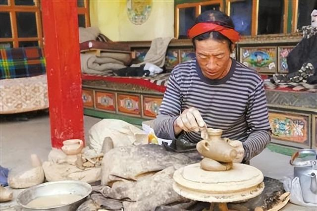 这项古老技艺的传承,从陶器的取材、作胚到烧制完全靠手工。制陶用泥多选自附近的山上,经过筛土、反复捶打揉捏后才能变成作胚的原料。陶器烧制多用干牛粪。